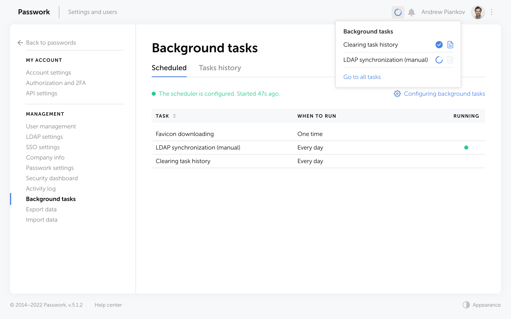 A new mechanism for handling tasks allows you to run them in the background. For example, you can run an LDAP synchronization task and still work in Passwork. Your synchronization task will run in the background.
