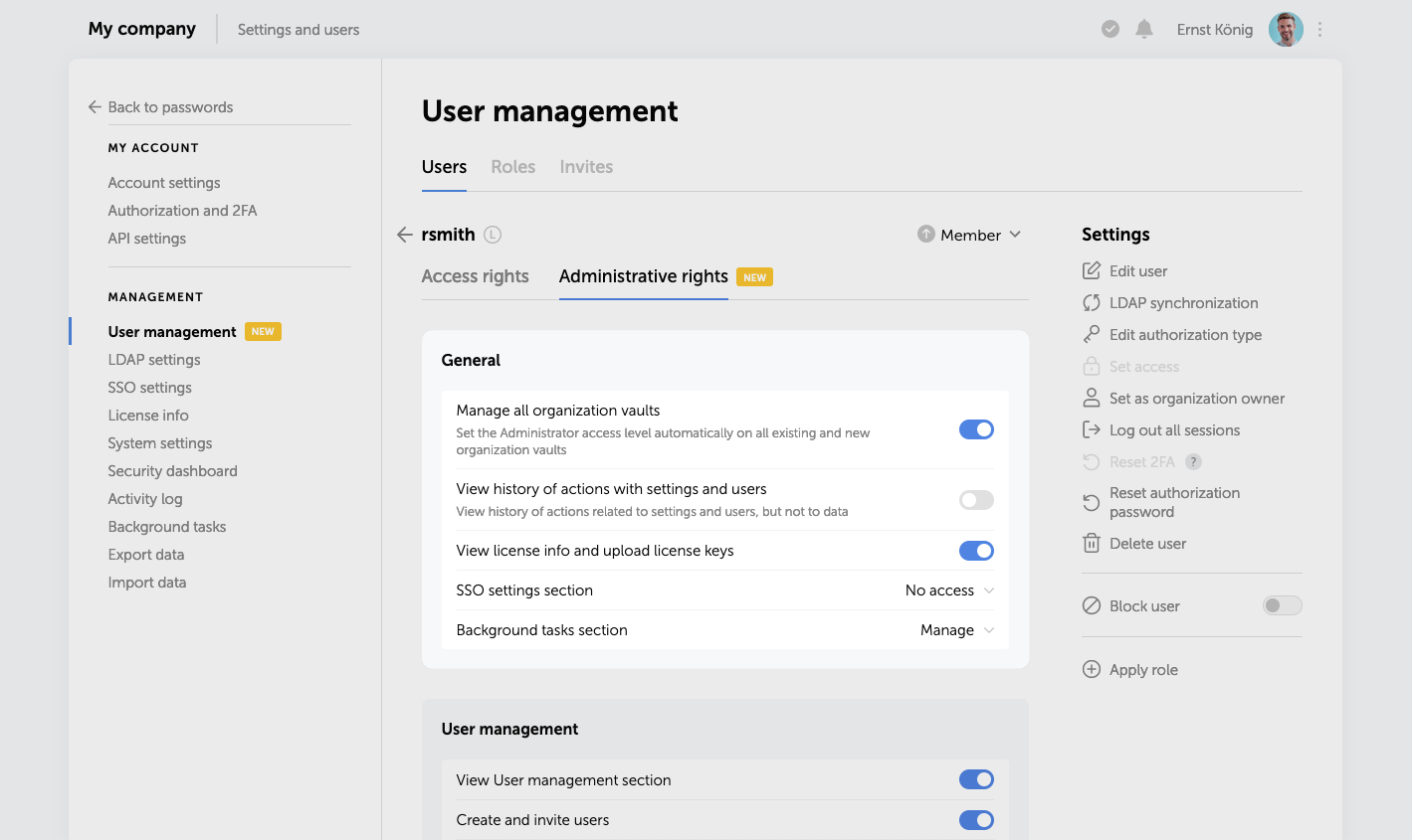 In this section, you can grant users access rights to manage all existing and new organization vaults, view the history of actions with settings and users, access license info and upload license keys, view and modify the parameters of SSO settings and Background tasks.