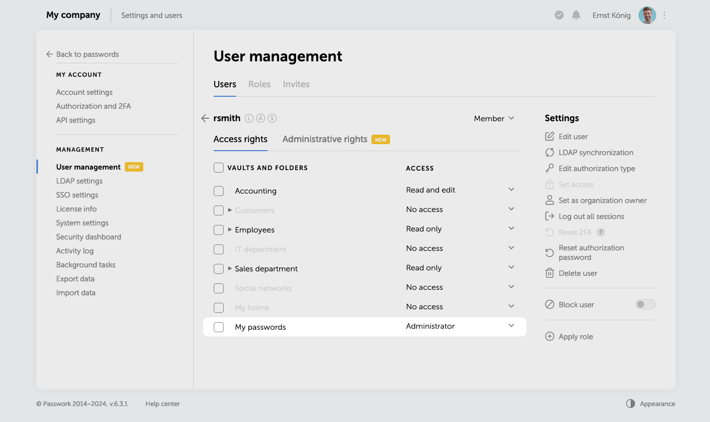 You can configure additional rights on the Administrative rights tab in User management. There are four settings sections to flexibly customize Passwork for your business: