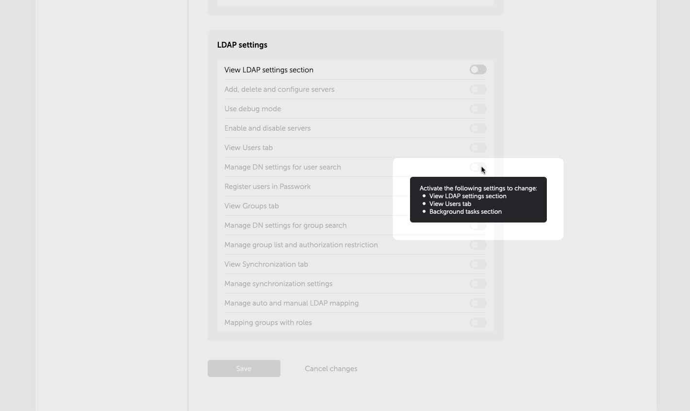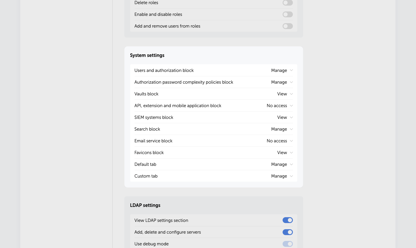 In this section of settings, you can grant users the right to view and modify specific groups of System settings.