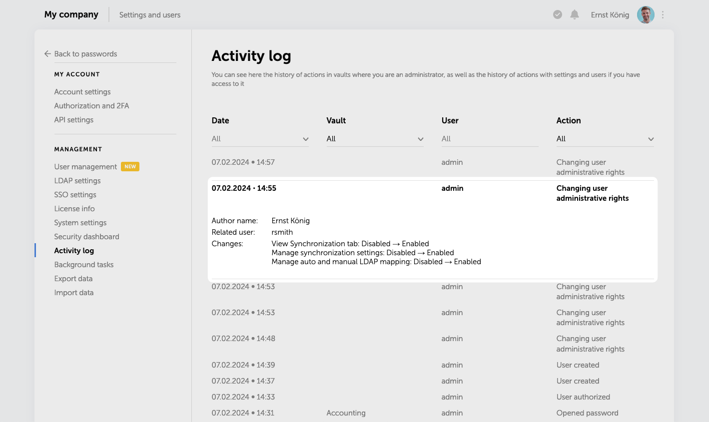 The event of changing user administrative rights has been added to the Activity log. All changes are now recorded in the Activity log, that includes the users who initiated such changes as well as each setting that was modified with its previous and current values.