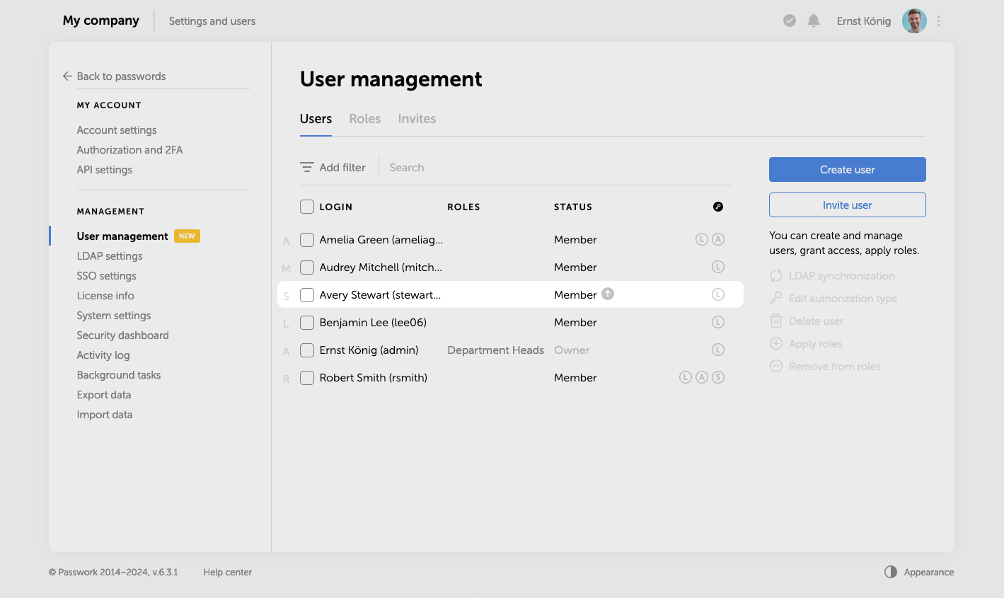 In Passwork 6.3, we have implemented numerous changes that significantly improve organization management efficiency, provide more flexible user permission settings, and increase security: