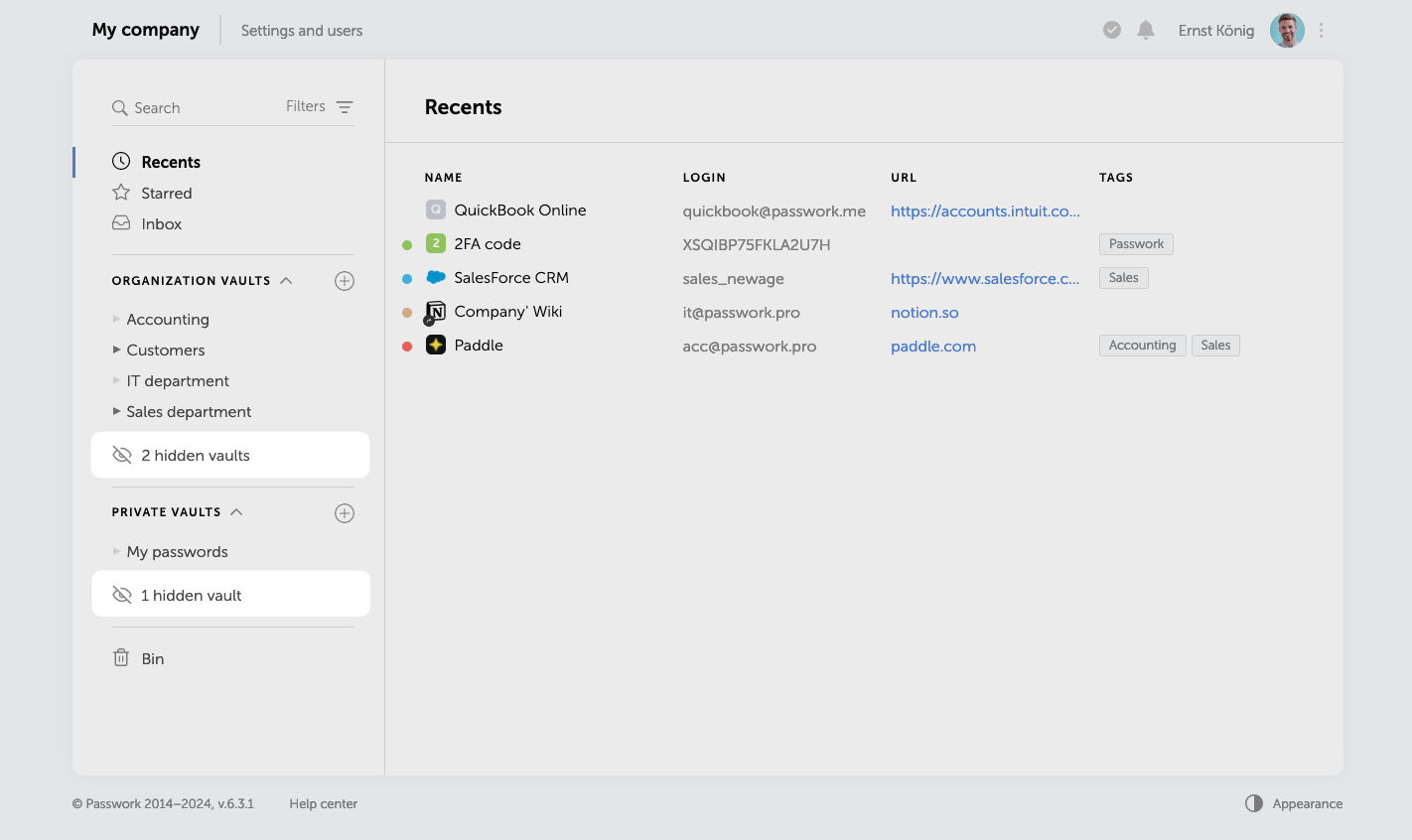 In the previous versions of Passwork only organization administrators were able to hide vaults. Also, only organization vaults could be hidden. In this new version, all users can hide any vaults. Hiding makes vaults invisible only to the users who choose to do it and does not affect others.