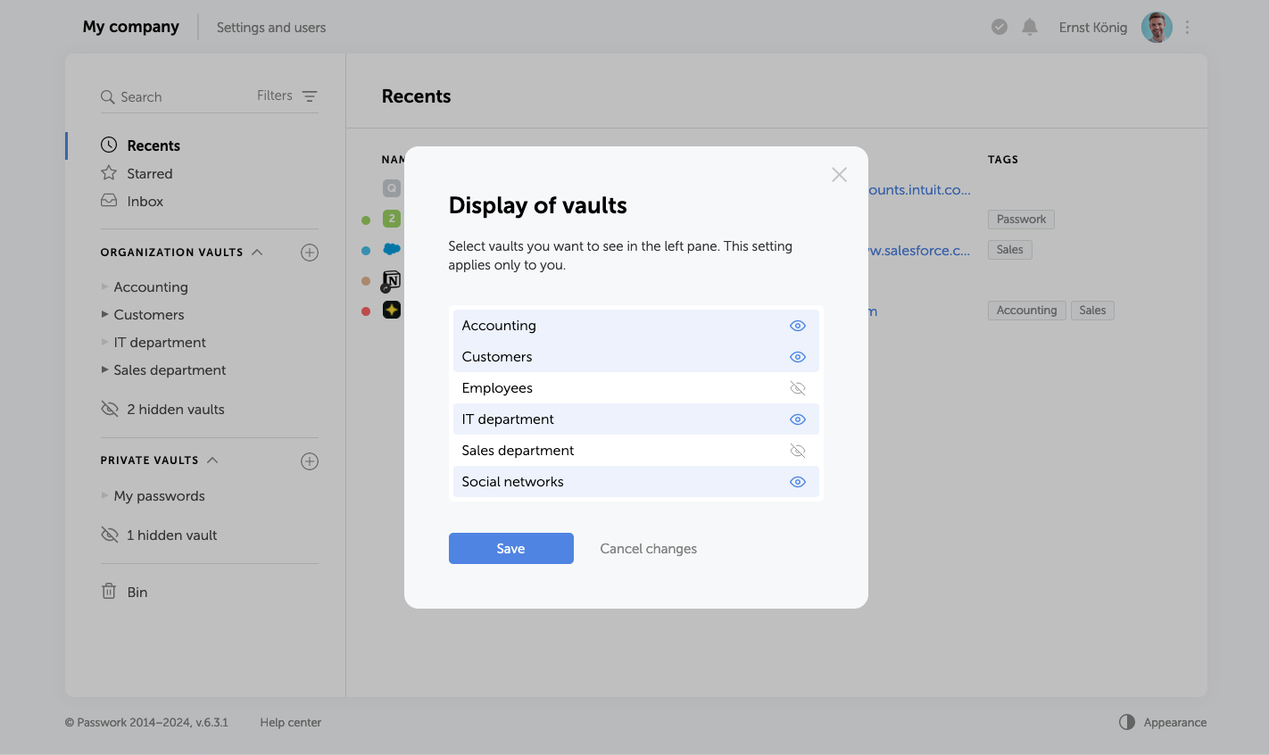 Besides hiding private vaults, employees with User management access can now see all vaults which they administer (including private vaults). The new feature which makes it possible to add users to private vaults has also been added to User management.